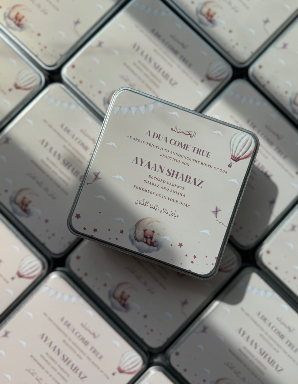 13cm by 13cm square. These fit approx 6 ladoos/Mithai pcs (matching gift bags are white with print on the front)